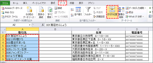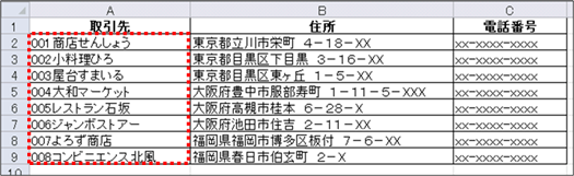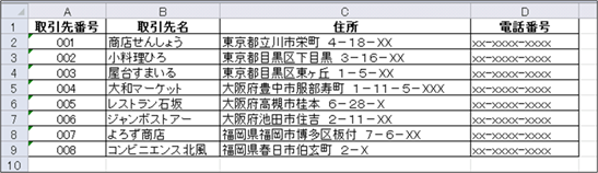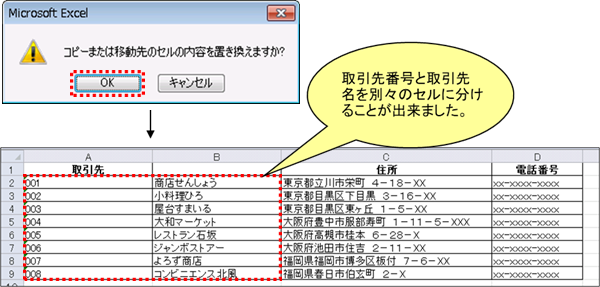 ので<OK>ボタンを押します。すると下図のように取引先番号と取引先名を別々のセル |