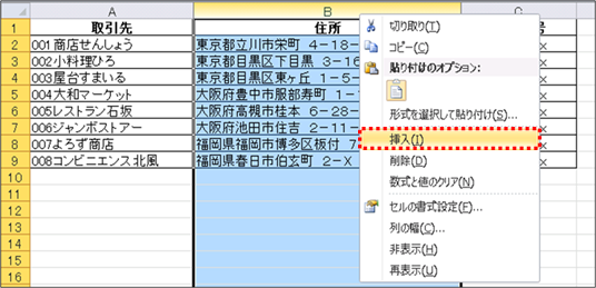 B列を選択して右クリックをし、[挿入]を選択します。 |