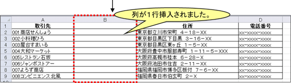 まず始めに、A列とB列の間に列を1行を挿入します。 |