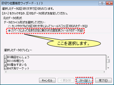 区切り位置指定ウィザードのダイアログボックスが表示されるので「スペースに〜」を選択して、 |