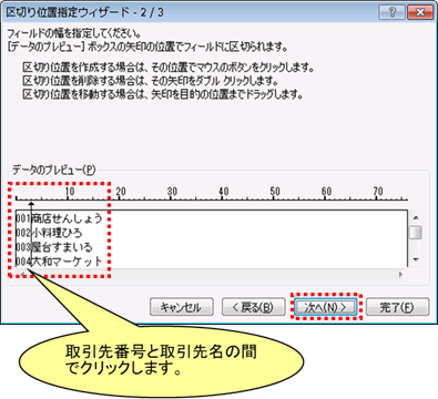 取引先番号と取引先名の間をクリックして区切り位置を示す矢印を表示させて、「次へ」を押します。 |