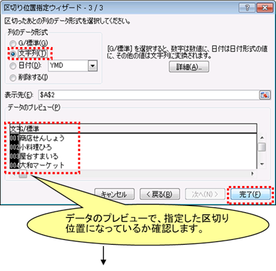 列のデータ形式にて「文字列」を選択し、「完了」ボタンを押します。 |
