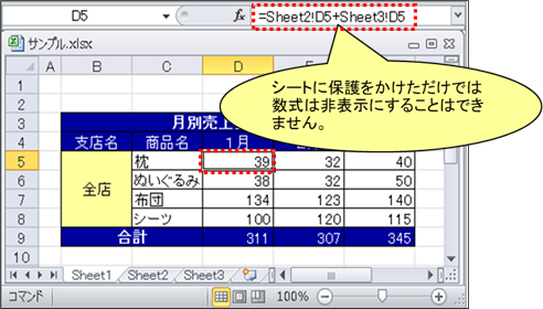 ※ご注意ください。シートに保護をかけないと、数式を非表示にすることはできません。 |