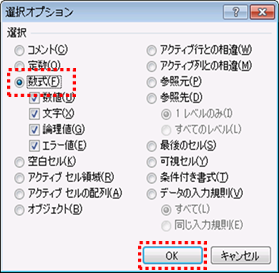 「選択オプション」画面が表示されますので[数式]にチェックを入れて[OK]を押します。 |