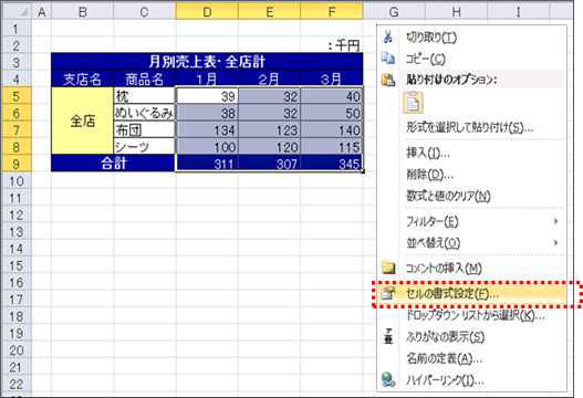 して、[セルの書式設定]を選択します。 |