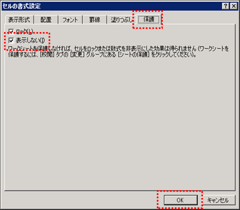 [保護]タブの[表示しない]にチェックを入れ[OK]を押します。 |