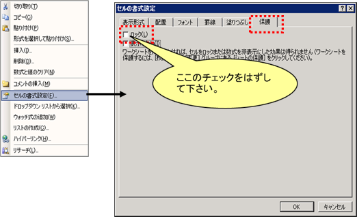[保護]タブの[ロック]のチェックをはずして[OK]を押します。 |