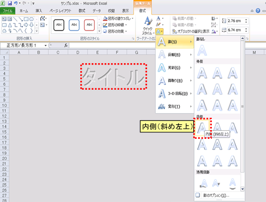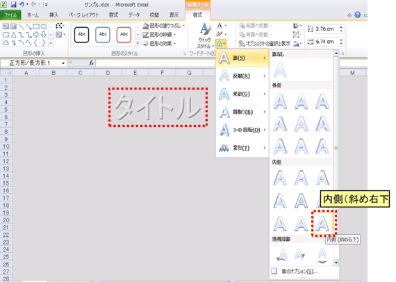 の[影付きスタイル]の[影]から、[内側(斜め右下)]を選択して影を付けます。 |