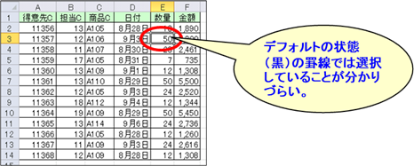■アクティブセルを目立たせるためにセルの書式設定で罫線の色を変更します。 |