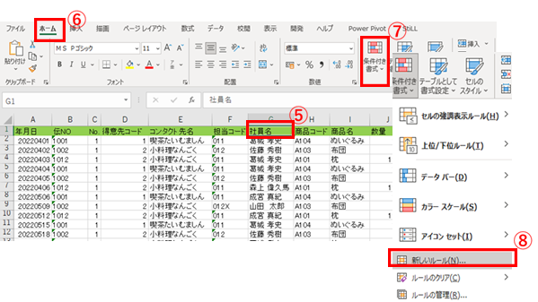 2.売上表の「社員名」項目(G1セル)に[条件付き書式]設定 |
