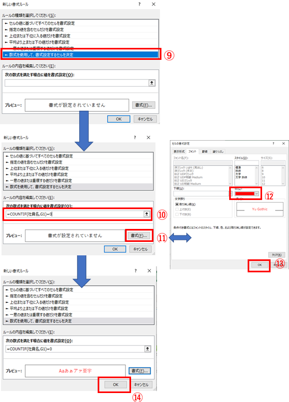 条件付書式設定で、COUNTIF関数を使って設定します。 |