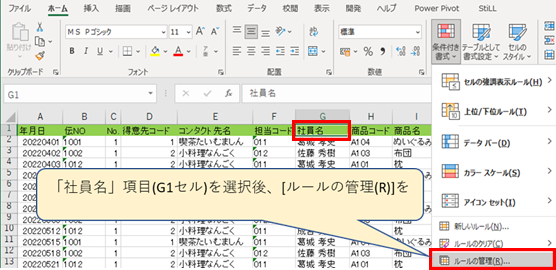 3.売上表の「社員名」項目(G1セル)の[条件付き書式]設定をG列に拡張 |