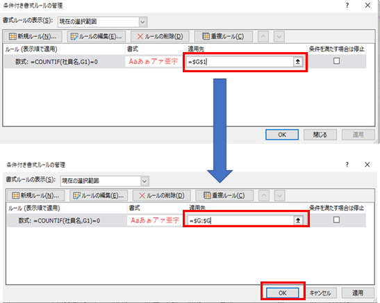 [適用先]を ”=$G$1” から”=$G:$G”に変更し、[OK]を選択。 |