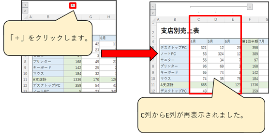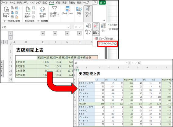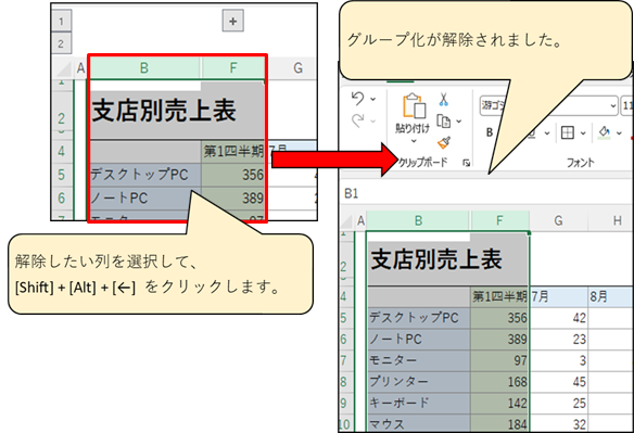 ([データ]タブ-[アウトライン]-[グループ解除]の「グループ解除」をクリックしても同じことができます。) |