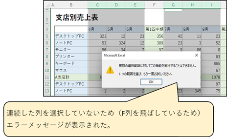 【注意】: 連続した行、列を選択しないとグループ化の設定はできません。 |