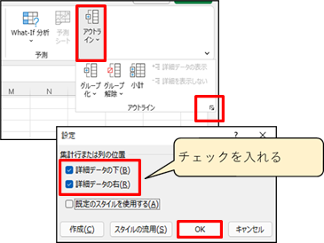 [データ]タブ-[アウトライン]の右下の矢印から設定画面を開き、 |