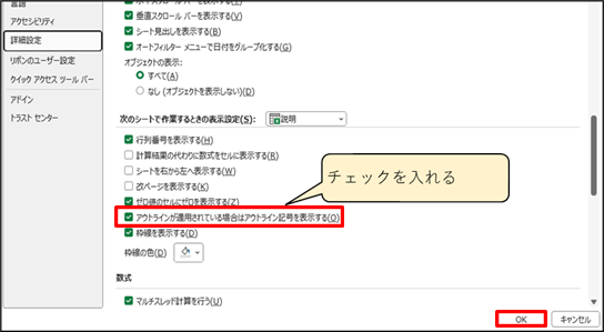 「アウトラインが適用されている場合はアウトライン記号を表示する」に |