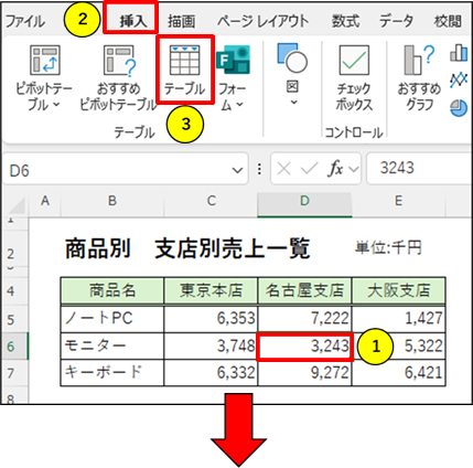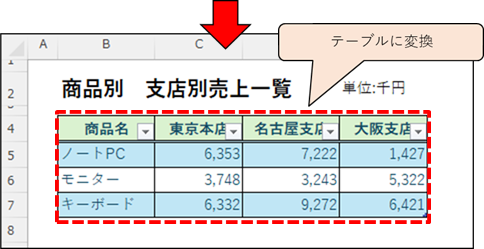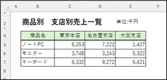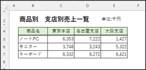 例として、下図を使用します。([商品別 支店別売上一覧データ]はDATAシート上にあるものとします) |