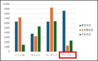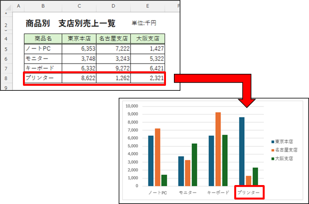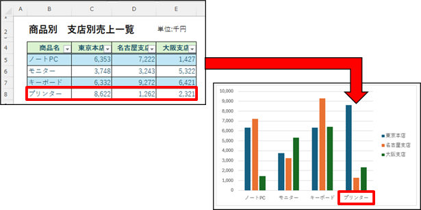 テーブルに新しいデータ(例ではプリンター)を追加すると、グラフも自動で更新されました。 |