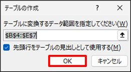 C「テーブルの作成」が表示されたら、「OK」をクリック |