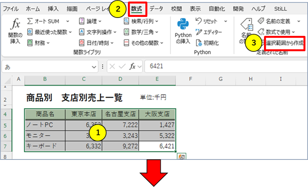 テーブル機能またはグラフのデータ範囲に名前をつけ、数式を設定します。 |
