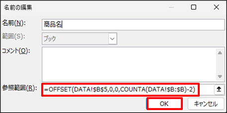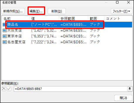 F[参照範囲]を編集する名前を選択し(例では「商品名」)、[編集]をクリック |