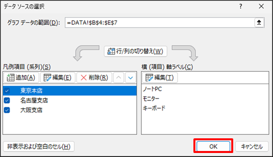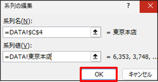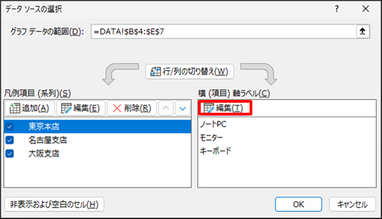 I[凡例項目]で任意の項目を選択後(例では東京本店)、[編集]をクリック |