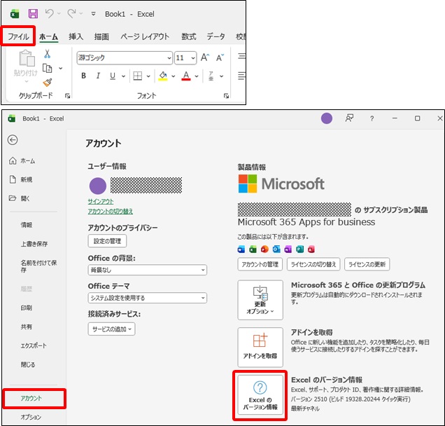 AExcel の [ファイル] タブ⇒ [アカウント] ⇒ [Excelのバージョン情報] をクリックします。