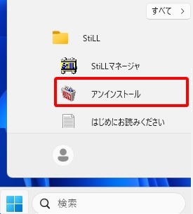 @Windows の[スタート] ⇒ [すべて] ⇒ [StiLL] ⇒ [アンインストール]を選択します。