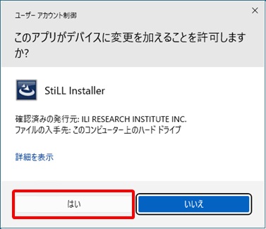 インストール時に使用した StiLL のインストールCD を PCに入れると 「ユーザーアカウント制御」画面が出ますので、[はい] をクリックします。