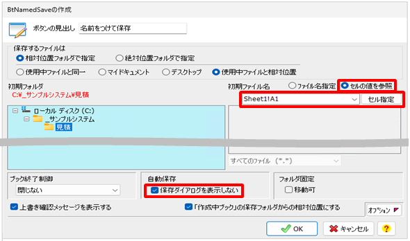 また、[BtNamedSave]の「自動保存オプション」にAUTOと入力すると、上記のファイル名で保存確認のダイアログを表示させないで保存させることができます。