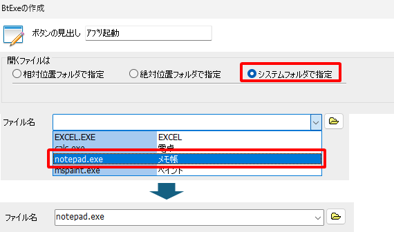 「BtExeの作成」画面の「システムフォルダで指定」を選択してファイル名一覧から「メモ帳」を選択してください。