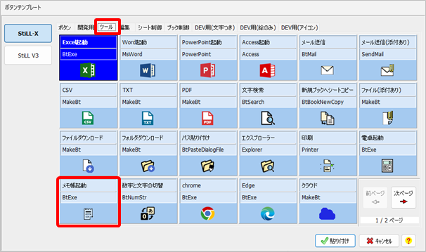 「ボタンテンプレート」画面で「ツール」を選択して「メモ帳起動」ボタンを選択して「貼り付け」をおこなってください。