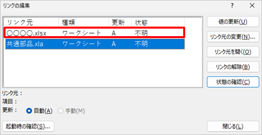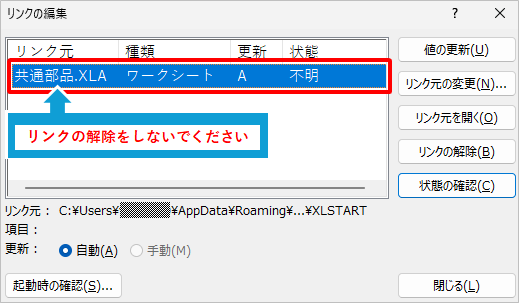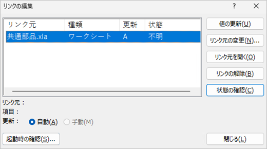 @「リンクの編集」で 「共通部品.xla」以外 のファイルへのリンクがあるか確認する