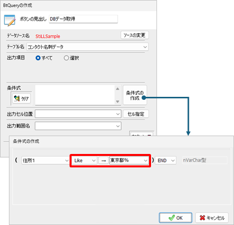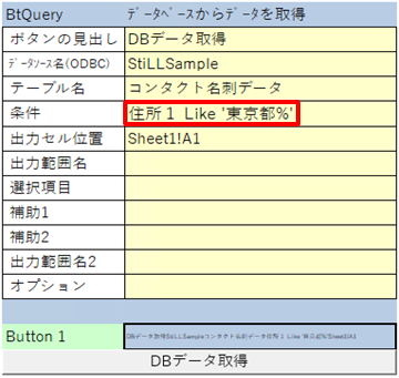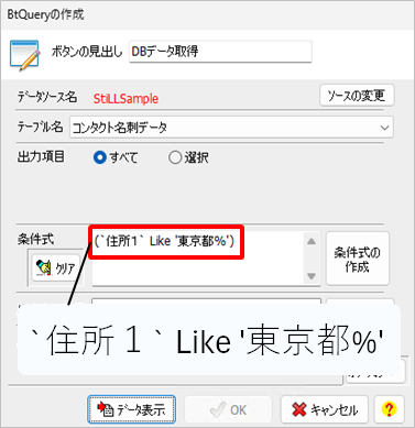 [DBデータ取得](BtQuery)ボタンであいまい条件式をしたい場合は、[Like]演算子を使用してください。